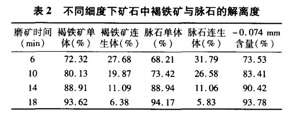 該礦的主要成分是褐鐵礦,也就是氧化鐵的水化合物。經(jīng)過(guò)比磁化系數(shù)測(cè)定,該礦的比磁化系數(shù)為53.2×10(-6)(cm.g-1),屬于弱磁性礦物。所以一般的弱磁和中磁選都比較難回收。根據(jù)原礦的組成,該礦的脈石解離度測(cè)定結(jié)果見(jiàn)表2。