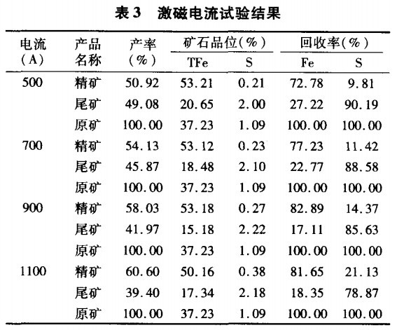 從表3結(jié)果可見(jiàn),激磁電流從500A增加到900A時(shí),精礦鐵品位和回收率都隨之增加,硫的品位降低。但當(dāng)激磁電流達(dá)到900A以后,繼續(xù)增大激磁電流。鐵精礦回收率增加,但品位卻隨之下降,而且鐵精礦中硫的品位大于0.3%,所以綜合考慮,選礦試驗(yàn)采用900A比較合適。