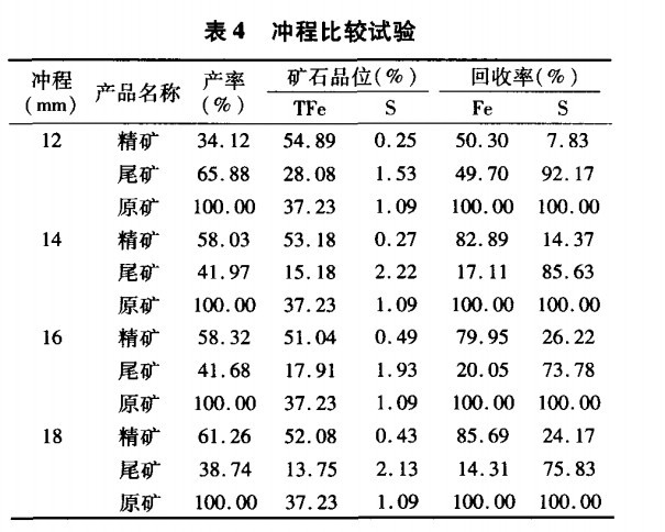 從表4可以看出,沖程在14mm指標(biāo)較好。說(shuō)明沖程在14mm的時(shí)候,各產(chǎn)品得到了較好的松散,在這種磁場(chǎng)作用下,精礦的產(chǎn)率達(dá)到58.03%,回收率達(dá)到了82.89%,*終硫在精礦里面的品位只有0.1%左右,達(dá)到了國(guó)標(biāo)要求。