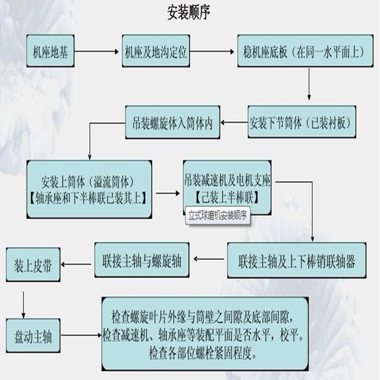 大家都知道設備的安裝是十分重要的,只有正確的安裝到位才能為良好的生產(chǎn)作業(yè)打下穩(wěn)定的基礎。那么塔磨機究竟該如何安裝呢?詳細安裝順序如下圖所示: