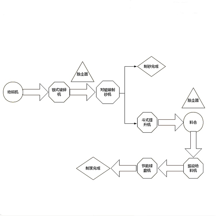 煤矸石的硬度不算太高,在使用它進行制砂時可以選擇對輥破、顎破、反擊破等組合使用,當然還需要配備一些輔助設備。近日來自山東泰安的李總需要購買煤矸石制砂制漿設備聯(lián)系到我們,根據(jù)他的需求我們?yōu)樗O計了方案。我們了解到李總的煤矸石原料為200mm,經過具體分析,需要使用到的設備有給料倉、對輥制砂機、斗式提升機、料倉、振動給料機、節(jié)能球磨機各一臺,顎式破碎設備和除塵器各兩臺,具體工藝流程如下: