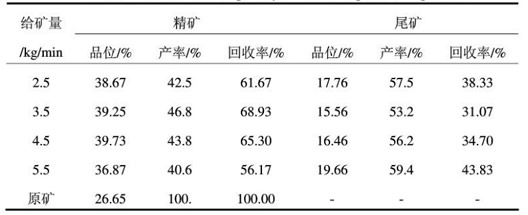 單位時(shí)間內(nèi)的給礦量對(duì)磁選設(shè)備分選效果的影響也較大。給礦量過大會(huì)使轉(zhuǎn)環(huán)的負(fù)荷較大,同時(shí)容易造成介質(zhì)堵塞,增加夾帶情況的發(fā)生和目的礦物的損失;給礦量過小又會(huì)使處理量減小,分選系統(tǒng)的使用不能完全發(fā)揮出來,造成效率低下,因此通過試驗(yàn)找到適當(dāng)?shù)慕o礦量也是非常有必要的。